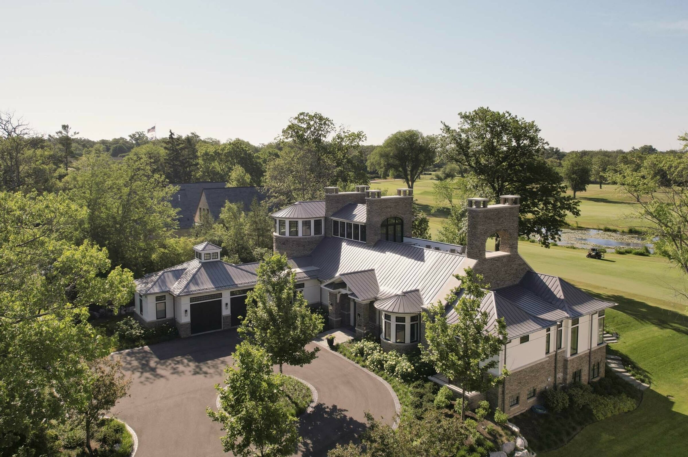 Details Championship golf course setting Monumental Kitchen with painted and walnut cabinetry set within paneled barrel vault feature Hidden bookcase entry to Primary Suite Backlit stone incorporated into fabric clad Dining Room bar cabinet