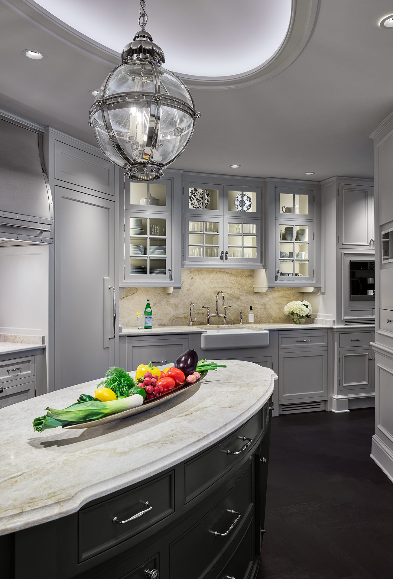 Details Radiused Kitchen island with ceiling dome and crown moulding, seating area with leather clad facetted panels High gloss paneled Office, paneled hallway with concealed doors Media Room with herringbone ceiling, stained beams and columns